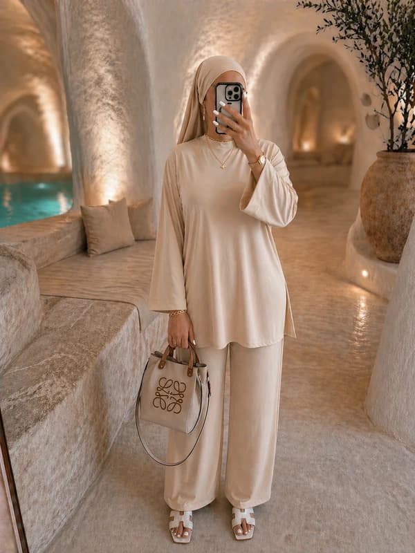 Burkini 3 pièces - ensemble maillot de bain modeste composé d'un pantalon, d'un haut manches longues et d'un voile. Couleur Beige.