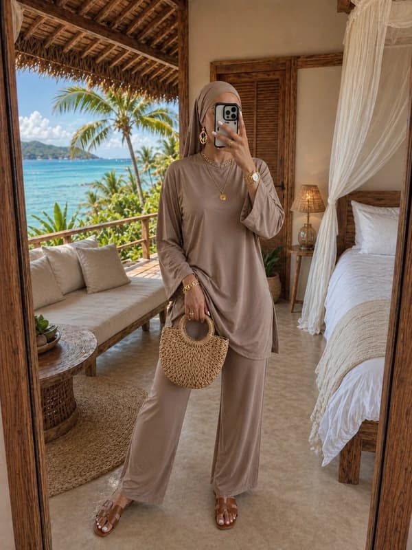 Burkini 3 pièces - ensemble maillot de bain modeste composé d'un pantalon, d'un haut manches longues et d'un voile. Couleur Taupe.